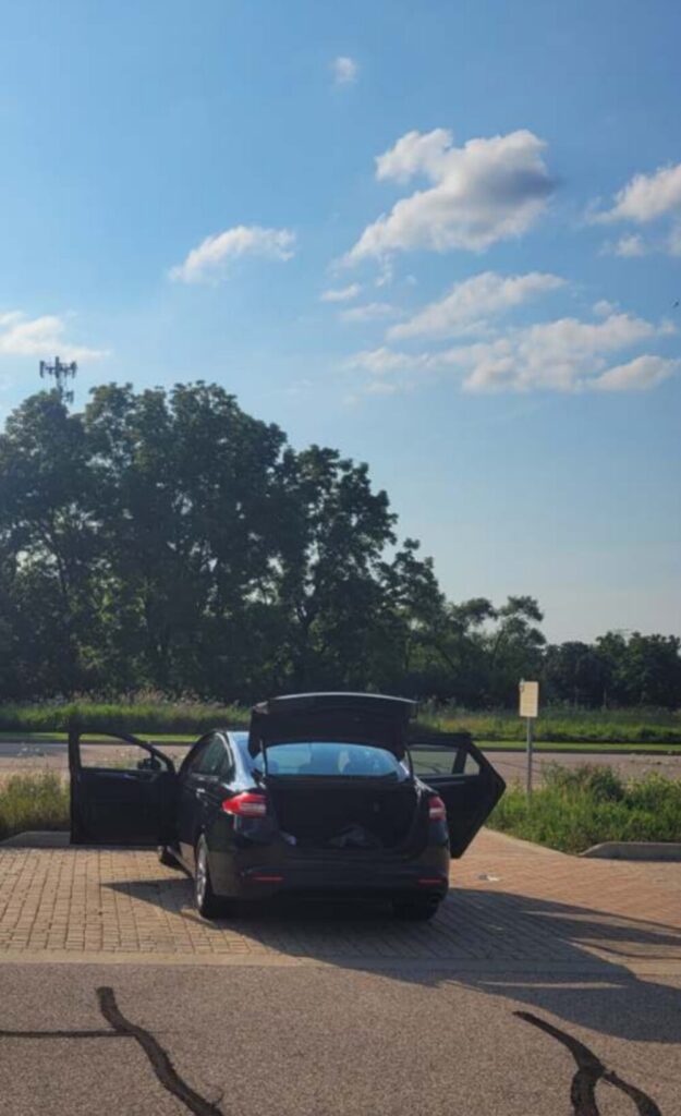 Returning to the west entrance parking lot at approximately 1554 hrs, I immediately observed a vehicle matching the description provided, a black Ford sedan, and upon approaching closer confirmed it to display the registration plate of the subject’s vehicle.