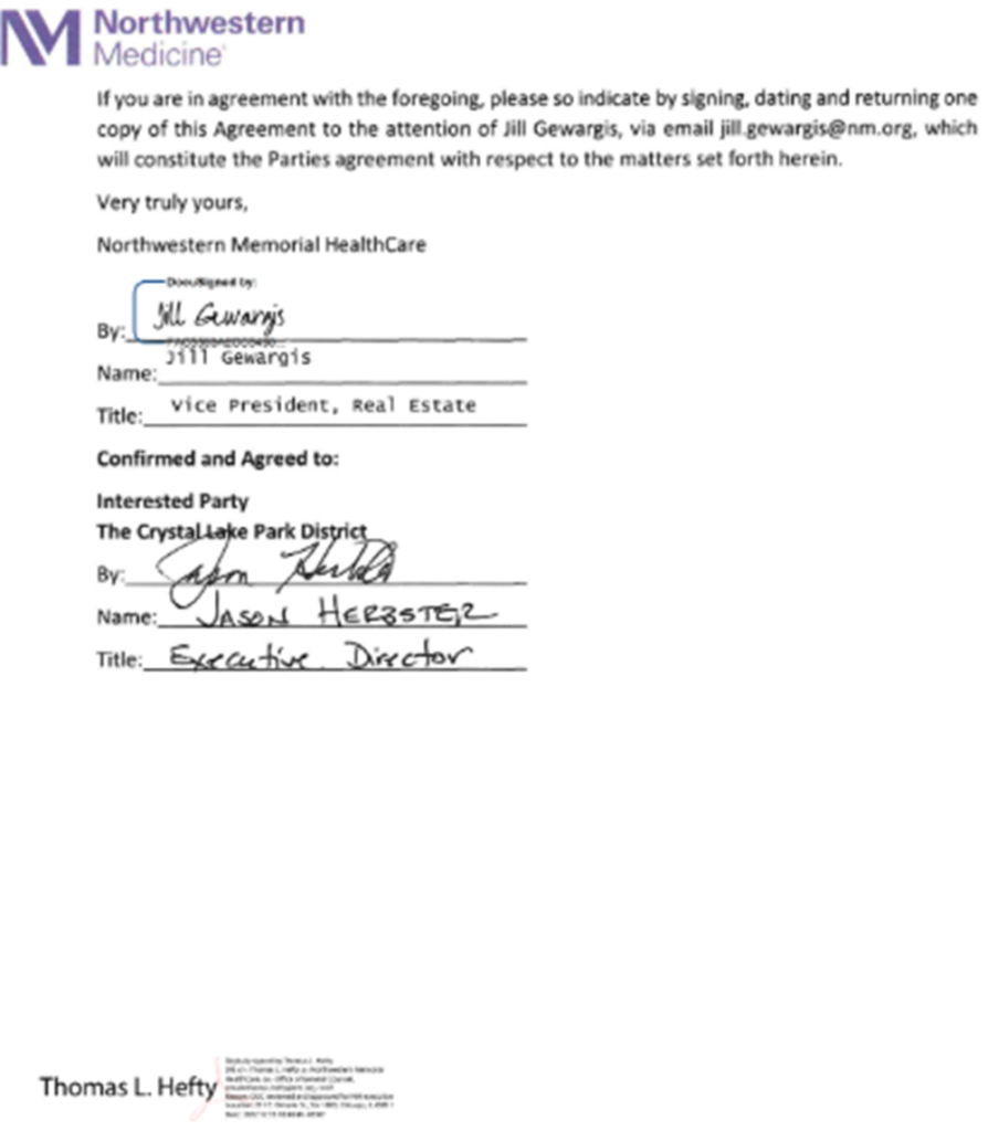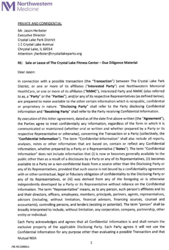 A Freedom of Information request prompted by contents in an email in the article below reveals the agreement between owner of HealthBridge Northwestern Medicine and the Crystal Lake Park District with regard to sharing information concerning due diligence, which, of course, includes any problems with the abandoned complex.