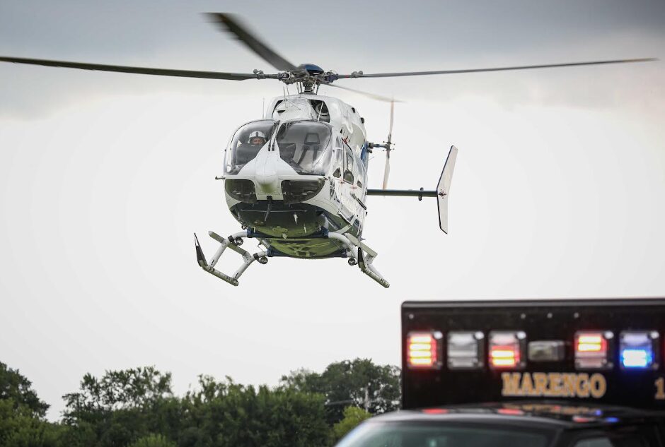 The helicopter landed at a soccer field at Marengo Community High School, where the patient was transferred and airlifted to Javon Bea Hospital Riverside in Rockford with serious injuries.