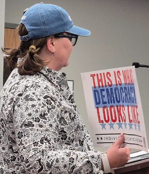 “This is what democracy looks like” says the placard held for the District 47 Board meeting audience to see.