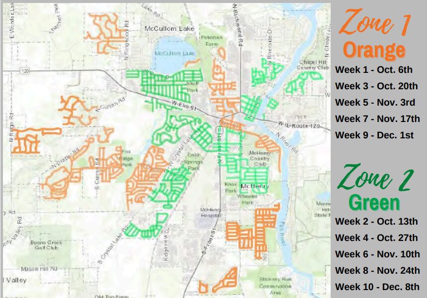 Flood Brothers’ curbside loose-leaf collection is on a bi-weekly zoned pick-up schedule. The City is divided into two (2) pick-up zones: Zone 1 (orange) & Zone 2 (green). See the map and dates below to determine your zone.
