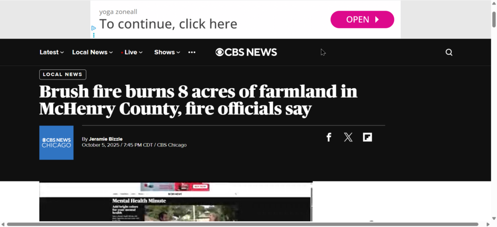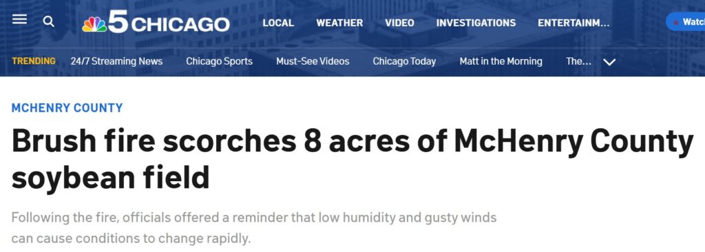 On Sunday, October 5, 2025, at 12:39 p.m., the Harvard Fire Protection District responded to the area of Boone-McHenry County Line Road and Yates Road for a reported brush fire on a farm property.
