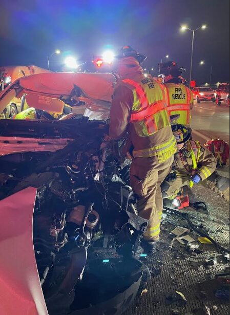 Firefighters arrived within minutes and located a heavily damaged vehicle in the middle lane with the adult male driver trapped inside.