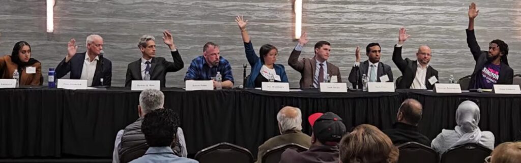 All candidates except Ford raised their hand in support of defunding ICE. (Abughazaleh is out of frame next to Amiwala on the left but she raised her hand.)
