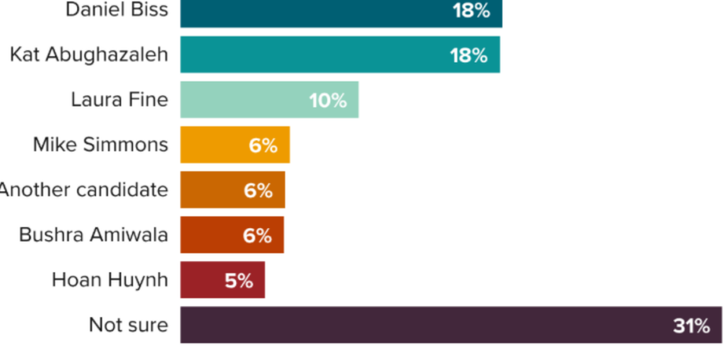 The only candidates who had at least half of the respondents recognize them were the frontrunners, Daniel Biss and Kat Abughazaleh. Excluded from the poll entirely were Justin Ford, Nick Pyati, Patricia Brown, Bethany Johnson, Howard Rosenblum, Natalie Angelo, and Mark Frederickson.