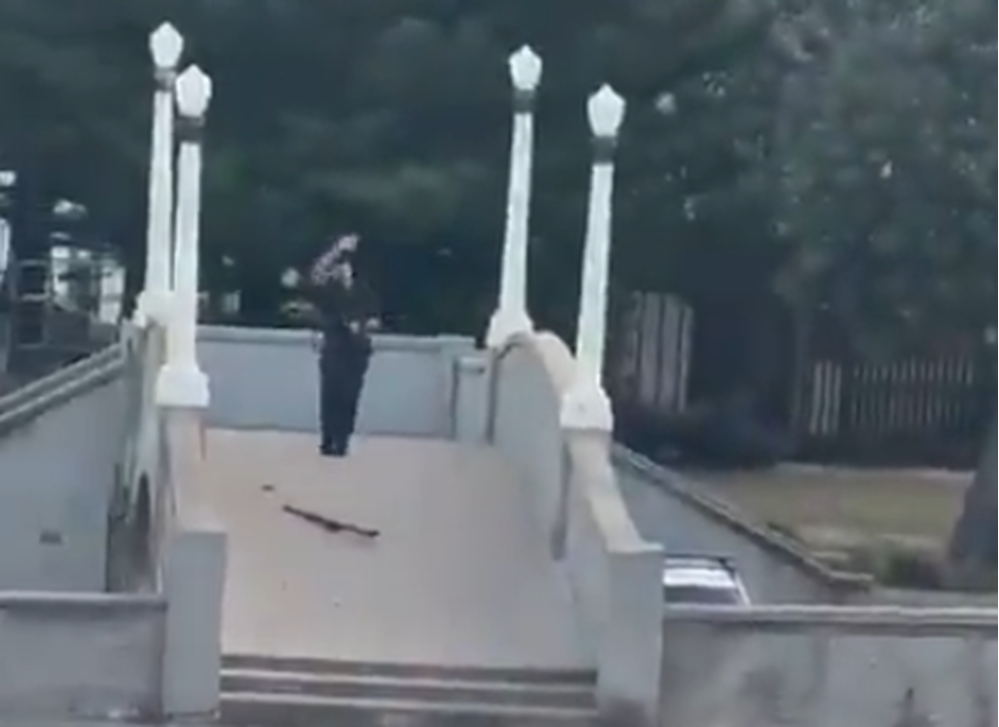 While the second man was at ground level the other one turned toward the camera (which he obviously did not know was recording or he would have shot whoever was holding the camera) and lifted his arm up several times shouting two words.