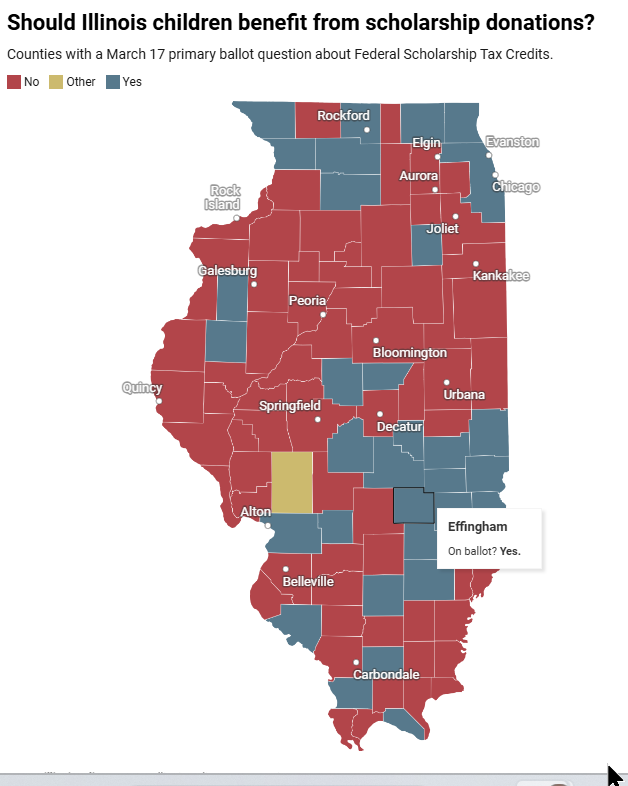 Residents in 32 Illinois counties will have an opportunity on the March 17 primary ballot to tell Gov. J.B. Pritzker whether they think the state’s students should benefit from the new federal tax credit being given for education donations.