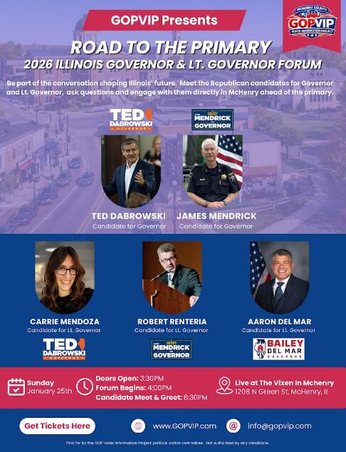 McHenry, IL — As Illinois voters prepare for the March 17, 2026 Republican Primary, the GOP Voter Information Project (GOPVIP) will host the Illinois Governor Voter Information Forum on Saturday, January 25, 2026, at The Vixen in McHenry.