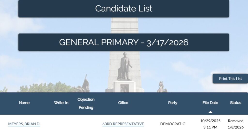 The reason for Meyers removal is the non-payment of a fine levied by the Illinois State Board of Elections for filing his second finance discloser statement late.