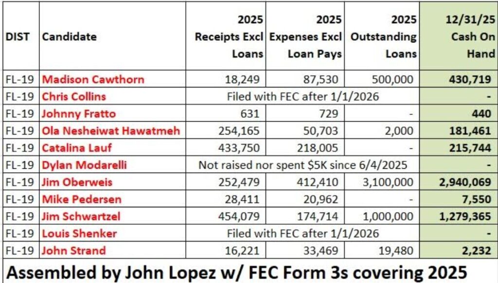 Also, The Conservative Record, on their Facebook page, reported this morning ex NY-27 Congressman Chris Collins of Marco Island is planning at least $500K worth of TV ad buys for the Super Bowl and the Olympics. Those ad buys are not reflected on the grid.