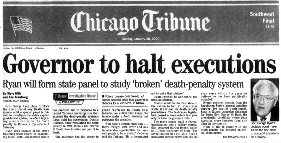 That’s what George Ryan did be halting executions, as you can see in the Chicago Tribune front page above.