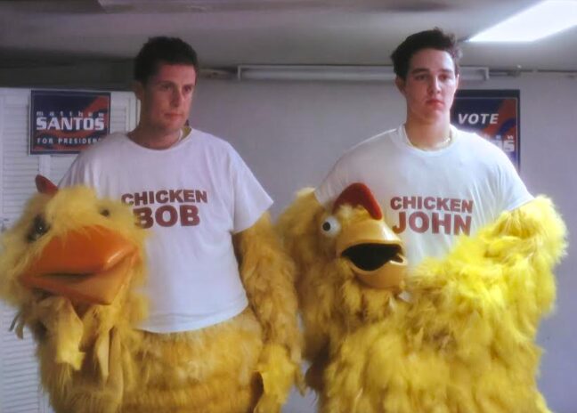 The campaign manager deploys two men dressed as chickens to gain attention.