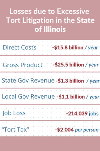 Springfield, IL — Illinois Citizens Against Lawsuit Abuse today highlighted the findings of a new economic analysis by The Perryman Group showing that excessive tort litigation is costing Illinois billions in lost jobs, income, and economic growth.According to the report excessive tort costs in Illinois result in:$15.8 billion in direct annual costs$25.5 billion in lost gross product each year214,039 jobs lost annually$2,004 per person in what researchers describe as a “tort tax”