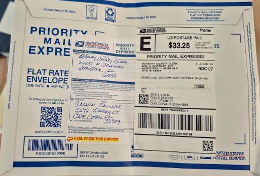 An extremely helpful clerk told me what I had to fill out, so I did, and paid my $33.25 to Express Mail my ballot back to Woodstock.