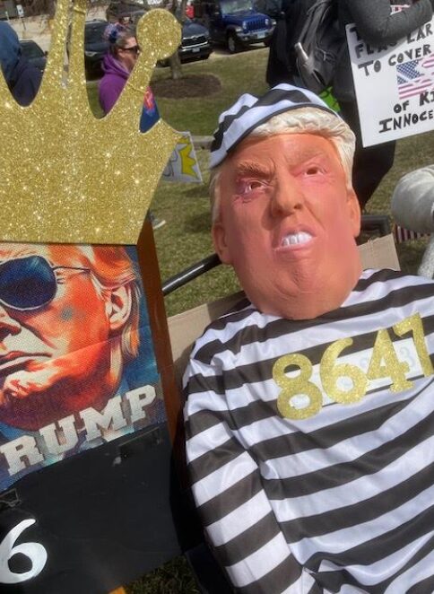 Echoing the “Lock her up” of the 2016 Presidential campaign is this representation of Donald Trump in prison stripes.
