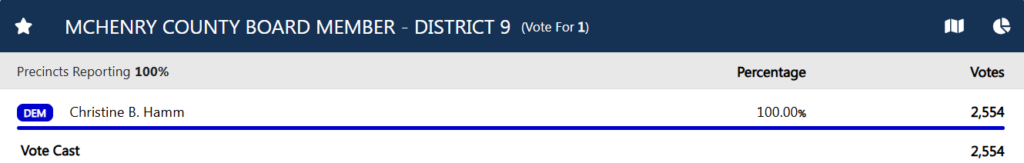 Here are the results for Christine Hamm in the 8th District of the McHenry County Board in the Democratic Party Primary Election: