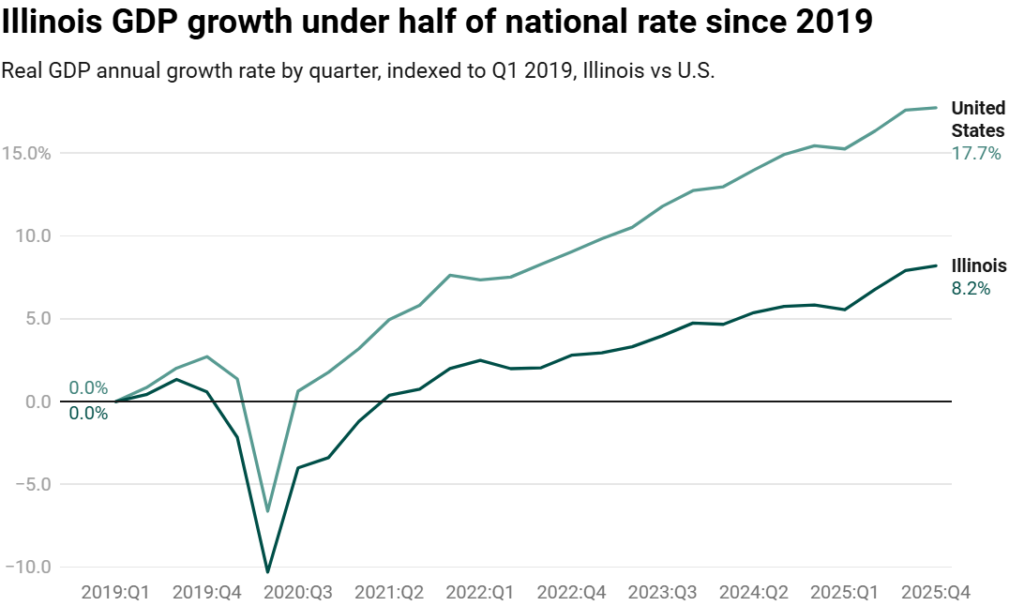Illinois’ persistent long-term economic underperformance remains a serious concern. Since 2019, Illinois’ real GDP has grown by an annual rate of just 8.2%, less than half the national 17.7%.