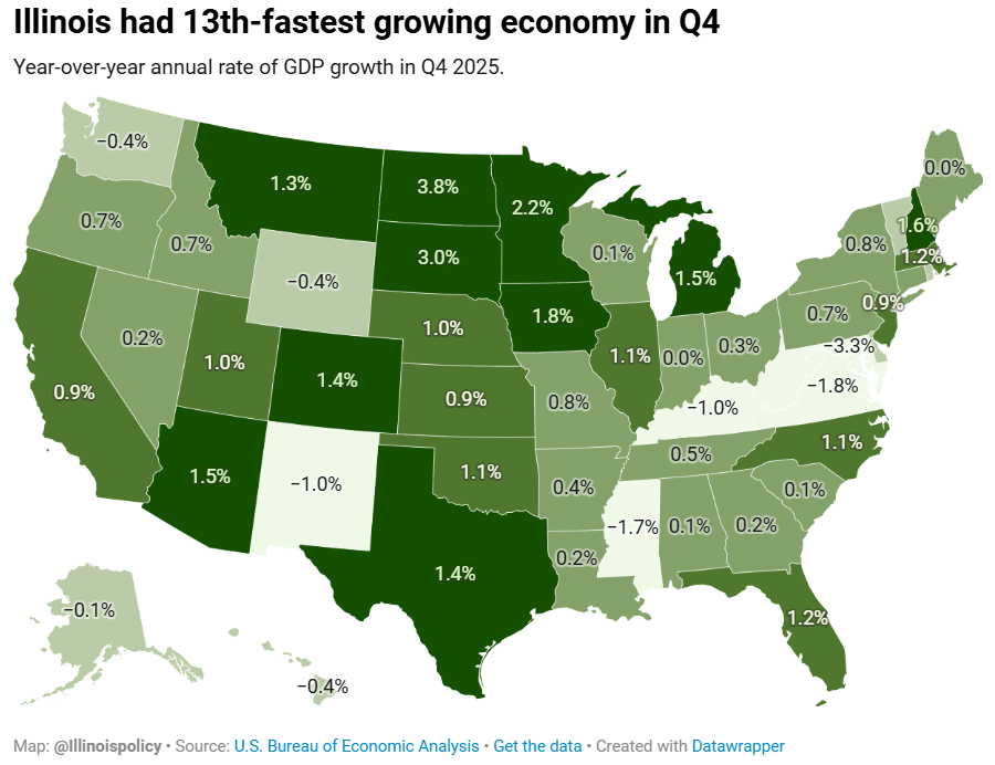Illinois’ fourth-quarter growth ranked 13th in the nation and sixth in the Midwest, highlighting the region’s relative resilience under current economic circumstances.