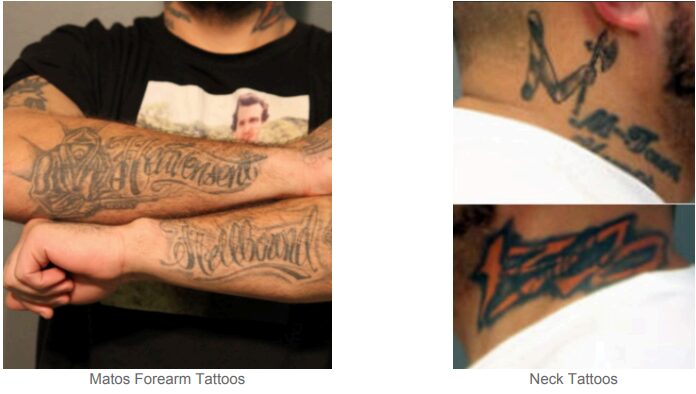 Matos has the following tattoos: “M-Town Kings” on the right side of his neck; “1300” on the left side of his neck; “Move in Silence” on his right hand; “Trust no one” on his left hand; “MOST WANTED” on his belly; “Heavensent, Hellbound” on his forearms; and “Jesus Christopher Matos” on his chest.